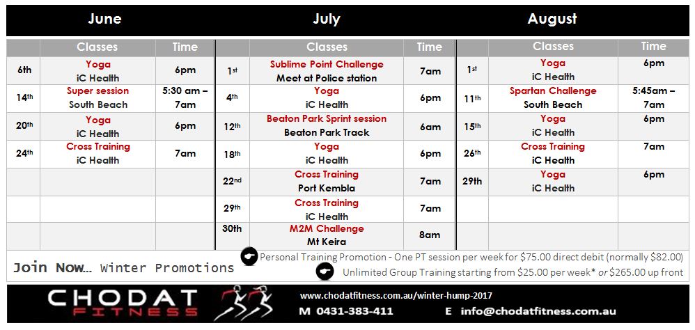 This year we have boosted our timetable in addition to our regular schedule that all clients can try, there is something for everyone. Jump out of your comfort zone and see what your body is capable of, you might even get lucky and win a prize for your efforts.